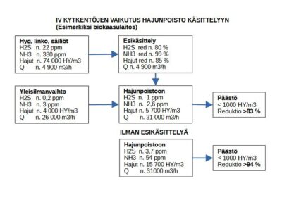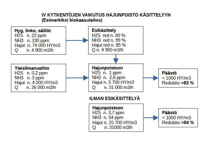Vastaavaa sivuvirtakäsittelyä voidaan käyttää myös olemassa olevan järjestelmän tehostamiseen. Loppukäsittelynä voidaan hyödyntää UV/aktiivihiiliyhdistelmää (esim. Saksalainen yhteistyökumppanimme Oxytec), joka vakauttaa hajunpoiston ja minimoi aktiivihiilen kulutuksen, tai kevyempää ratkaisua tapauksesta riippuen.